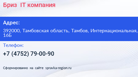 Бриз+, IT-компания по адресу 392000, Тамбовская область, Тамбов, Интернациональная, 16Б в дальнейшем Организация, размещена в следующих категориях: