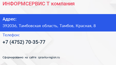 ИНФОРМСЕРВИС-Т, компания по адресу 392036, Тамбовская область, Тамбов, Красная, 8 в дальнейшем Организация, размещена в следующих категориях: