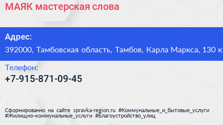 МАЯК, мастерская слова по адресу 392000, Тамбовская область, Тамбов, Карла Маркса, 130 к1 в дальнейшем Организация, размещена в следующих категориях: