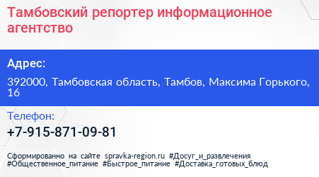 Тамбовский репортер, информационное агентство по адресу 392000, Тамбовская область, Тамбов, Максима Горького, 16 в дальнейшем Организация, размещена в следующих категориях: