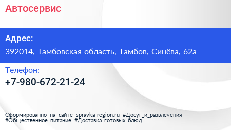 Автосервис по адресу 392014, Тамбовская область, Тамбов, Синёва, 62а в дальнейшем Организация, размещена в следующих категориях: