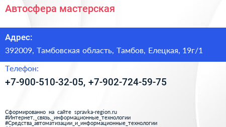 Автосфера, мастерская по адресу 392009, Тамбовская область, Тамбов, Елецкая, 19г/1 в дальнейшем Организация, размещена в следующих категориях: