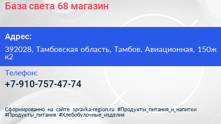 База света 68, магазин по адресу 392028, Тамбовская область, Тамбов, Авиационная, 150ж к2 в дальнейшем Организация, размещена в следующих категориях: