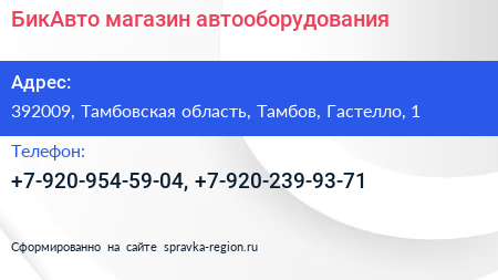 БикАвто, магазин автооборудования по адресу 392009, Тамбовская область, Тамбов, Гастелло, 1 в дальнейшем Организация, размещена в следующих категориях: