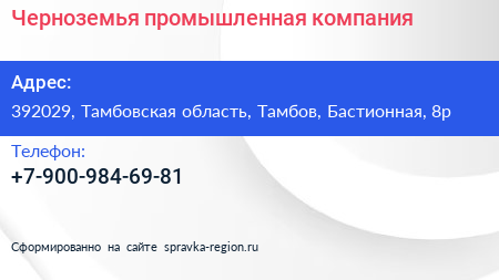 Черноземья, промышленная компания по адресу 392029, Тамбовская область, Тамбов, Бастионная, 8р в дальнейшем Организация, размещена в следующих категориях: