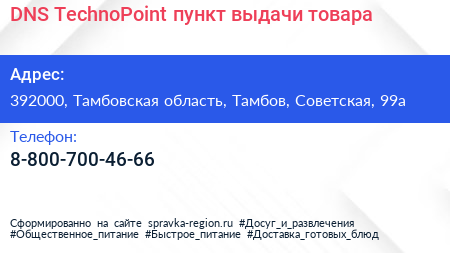 DNS TechnoPoint, пункт выдачи товара по адресу 392000, Тамбовская область, Тамбов, Советская, 99а в дальнейшем Организация, размещена в следующих категориях: