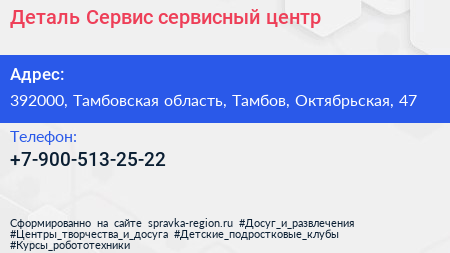 Деталь-Сервис, сервисный центр по адресу 392000, Тамбовская область, Тамбов, Октябрьская, 47 в дальнейшем Организация, размещена в следующих категориях: