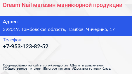 Dream Nail, магазин маникюрной продукции по адресу 392019, Тамбовская область, Тамбов, Чичерина, 17 в дальнейшем Организация, размещена в следующих категориях: