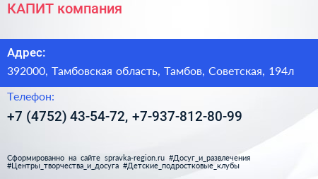 КАПИТ, компания по адресу 392000, Тамбовская область, Тамбов, Советская, 194л в дальнейшем Организация, размещена в следующих категориях: