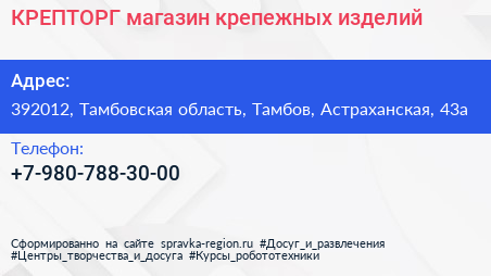 КРЕПТОРГ, магазин крепежных изделий по адресу 392012, Тамбовская область, Тамбов, Астраханская, 43а в дальнейшем Организация, размещена в следующих категориях: