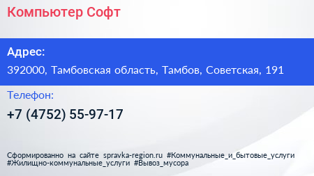 Компьютер-Софт по адресу 392000, Тамбовская область, Тамбов, Советская, 191 в дальнейшем Организация, размещена в следующих категориях: