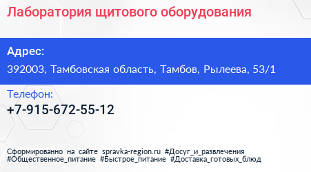 Лаборатория щитового оборудования по адресу 392003, Тамбовская область, Тамбов, Рылеева, 53/1 в дальнейшем Организация, размещена в следующих категориях: