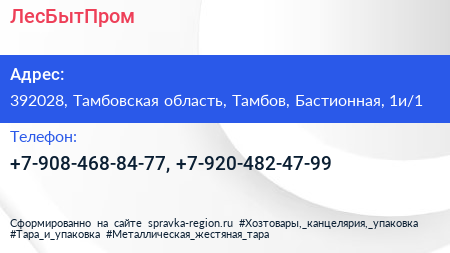 ЛесБытПром по адресу 392028, Тамбовская область, Тамбов, Бастионная, 1и/1 в дальнейшем Организация, размещена в следующих категориях: