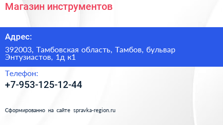Магазин инструментов по адресу 392003, Тамбовская область, Тамбов, бульвар Энтузиастов, 1д к1 в дальнейшем Организация, размещена в следующих категориях:
