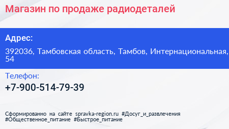 Магазин по продаже радиодеталей по адресу 392036, Тамбовская область, Тамбов, Интернациональная, 54 в дальнейшем Организация, размещена в следующих категориях: