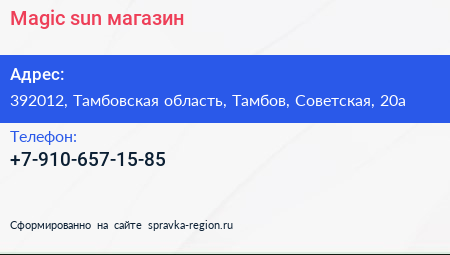 Magic sun, магазин по адресу 392012, Тамбовская область, Тамбов, Советская, 20а в дальнейшем Организация, размещена в следующих категориях: