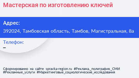 Мастерская по изготовлению ключей по адресу 392024, Тамбовская область, Тамбов, Магистральная, 8а в дальнейшем Организация, размещена в следующих категориях: