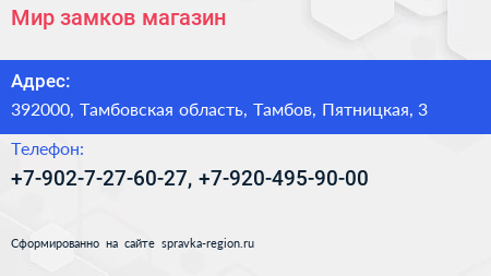 Мир замков, магазин по адресу 392000, Тамбовская область, Тамбов, Пятницкая, 3 в дальнейшем Организация, размещена в следующих категориях: