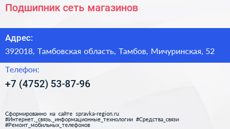 Подшипник, сеть магазинов по адресу 392018, Тамбовская область, Тамбов, Мичуринская, 52 в дальнейшем Организация, размещена в следующих категориях:
