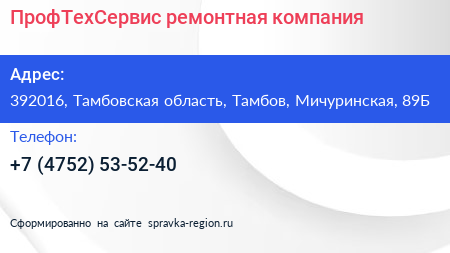ПрофТехСервис, ремонтная компания по адресу 392016, Тамбовская область, Тамбов, Мичуринская, 89Б в дальнейшем Организация, размещена в следующих категориях: