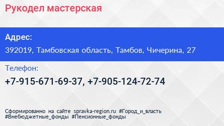 Рукодел, мастерская по адресу 392019, Тамбовская область, Тамбов, Чичерина, 27 в дальнейшем Организация, размещена в следующих категориях:
