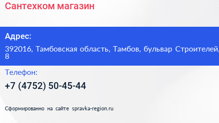 Сантехком, магазин по адресу 392016, Тамбовская область, Тамбов, бульвар Строителей, 8 в дальнейшем Организация, размещена в следующих категориях: