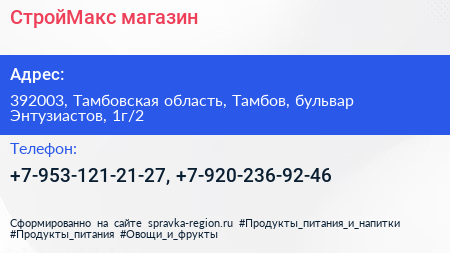 СтройМакс, магазин по адресу 392003, Тамбовская область, Тамбов, бульвар Энтузиастов, 1г/2 в дальнейшем Организация, размещена в следующих категориях: