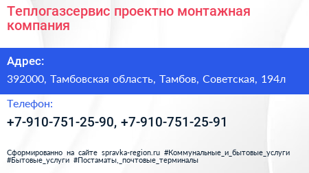 Теплогазсервис, проектно-монтажная компания по адресу 392000, Тамбовская область, Тамбов, Советская, 194л в дальнейшем Организация, размещена в следующих категориях: