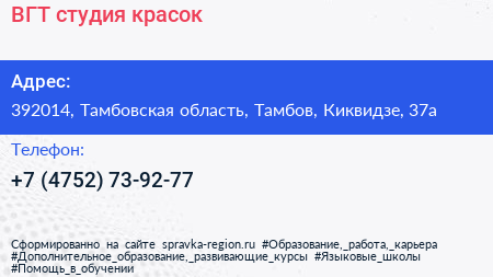 ВГТ, студия красок по адресу 392014, Тамбовская область, Тамбов, Киквидзе, 37а в дальнейшем Организация, размещена в следующих категориях: