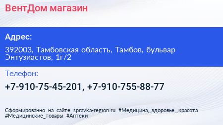 ВентДом, магазин по адресу 392003, Тамбовская область, Тамбов, бульвар Энтузиастов, 1г/2 в дальнейшем Организация, размещена в следующих категориях: