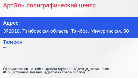 АртЭль, полиграфический центр по адресу 392018, Тамбовская область, Тамбов, Мичуринская, 50 в дальнейшем Организация, размещена в следующих категориях: