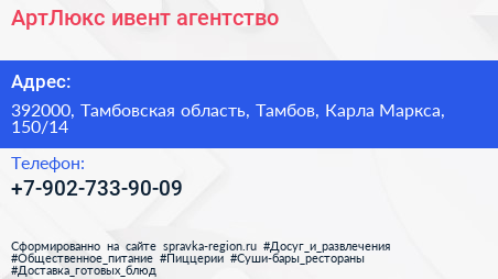 АртЛюкс, ивент-агентство по адресу 392000, Тамбовская область, Тамбов, Карла Маркса, 150/14 в дальнейшем Организация, размещена в следующих категориях: