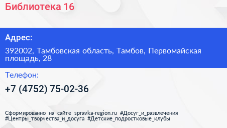 Библиотека №16 по адресу 392002, Тамбовская область, Тамбов, Первомайская площадь, 28 в дальнейшем Организация, размещена в следующих категориях: