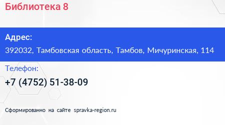 Библиотека №8 по адресу 392032, Тамбовская область, Тамбов, Мичуринская, 114 в дальнейшем Организация, размещена в следующих категориях: