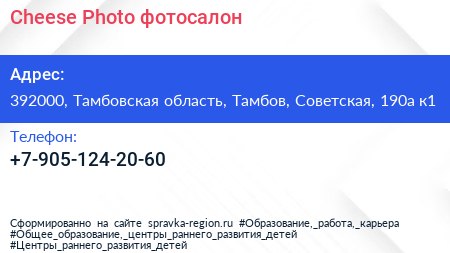 Cheese Photo, фотосалон по адресу 392000, Тамбовская область, Тамбов, Советская, 190а к1 в дальнейшем Организация, размещена в следующих категориях: