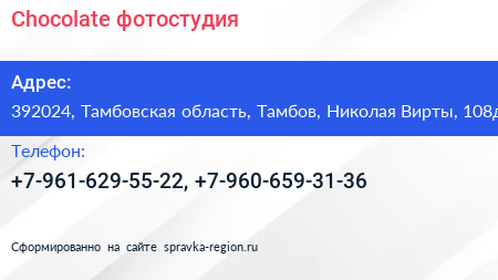 Chocolate, фотостудия по адресу 392024, Тамбовская область, Тамбов, Николая Вирты, 108д в дальнейшем Организация, размещена в следующих категориях: