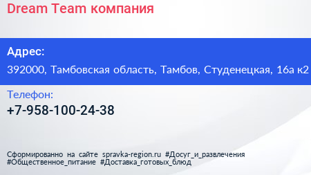 Dream Team, компания по адресу 392000, Тамбовская область, Тамбов, Студенецкая, 16а к2 в дальнейшем Организация, размещена в следующих категориях: