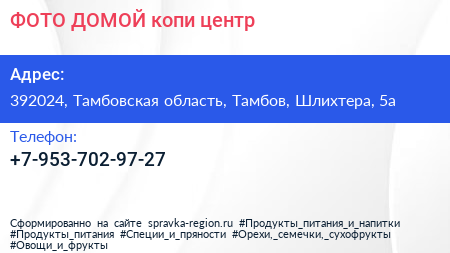 ФОТО ДОМОЙ, копи-центр по адресу 392024, Тамбовская область, Тамбов, Шлихтера, 5а в дальнейшем Организация, размещена в следующих категориях: