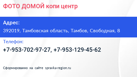 ФОТО ДОМОЙ, копи-центр по адресу 392019, Тамбовская область, Тамбов, Свободная, 8 в дальнейшем Организация, размещена в следующих категориях: