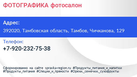ФОТОГРАФИКА, фотосалон по адресу 392020, Тамбовская область, Тамбов, Чичканова, 129 в дальнейшем Организация, размещена в следующих категориях:
