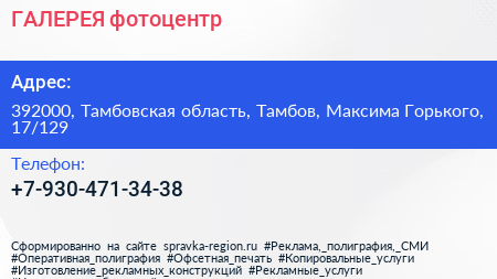 ГАЛЕРЕЯ, фотоцентр по адресу 392000, Тамбовская область, Тамбов, Максима Горького, 17/129 в дальнейшем Организация, размещена в следующих категориях: