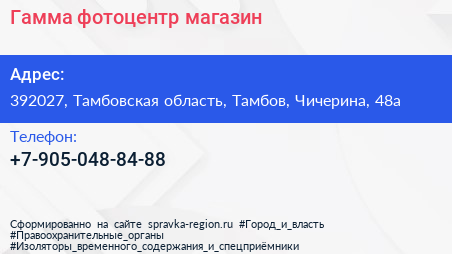 Гамма, фотоцентр-магазин по адресу 392027, Тамбовская область, Тамбов, Чичерина, 48а в дальнейшем Организация, размещена в следующих категориях: