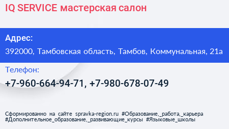 IQ-SERVICE, мастерская-салон по адресу 392000, Тамбовская область, Тамбов, Коммунальная, 21а в дальнейшем Организация, размещена в следующих категориях: