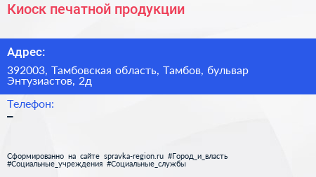 Киоск печатной продукции по адресу 392003, Тамбовская область, Тамбов, бульвар Энтузиастов, 2д в дальнейшем Организация, размещена в следующих категориях: