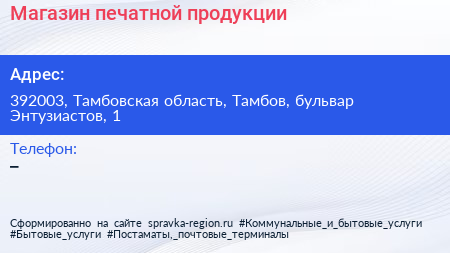 Магазин печатной продукции по адресу 392003, Тамбовская область, Тамбов, бульвар Энтузиастов, 1 в дальнейшем Организация, размещена в следующих категориях: