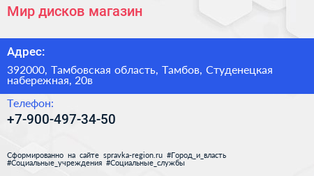 Мир дисков, магазин по адресу 392000, Тамбовская область, Тамбов, Студенецкая набережная, 20в в дальнейшем Организация, размещена в следующих категориях: