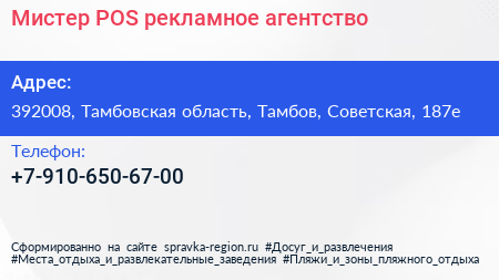 Мистер POS, рекламное агентство по адресу 392008, Тамбовская область, Тамбов, Советская, 187е в дальнейшем Организация, размещена в следующих категориях: