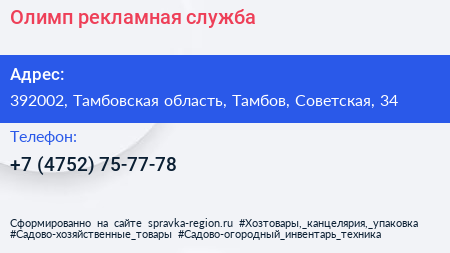 Олимп, рекламная служба по адресу 392002, Тамбовская область, Тамбов, Советская, 34 в дальнейшем Организация, размещена в следующих категориях: