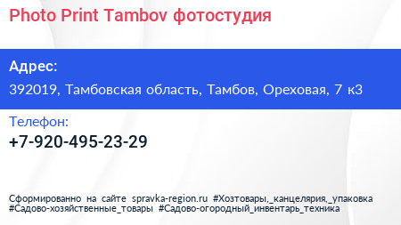 Photo Print Tambov, фотостудия по адресу 392019, Тамбовская область, Тамбов, Ореховая, 7 к3 в дальнейшем Организация, размещена в следующих категориях: