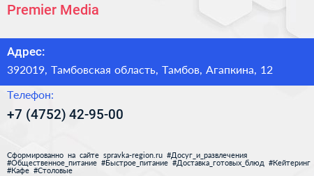 Premier Media по адресу 392019, Тамбовская область, Тамбов, Агапкина, 12 в дальнейшем Организация, размещена в следующих категориях: